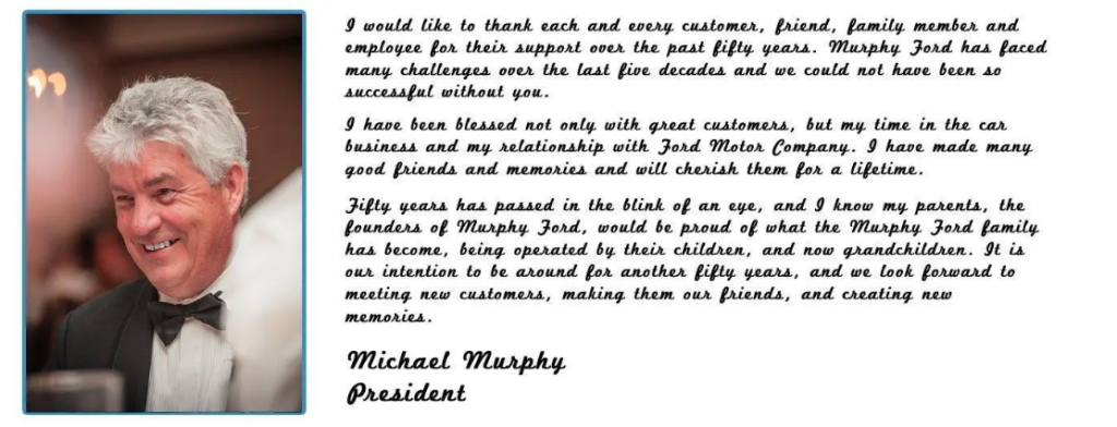 We are coming to our 50th anniversary of selling and servicing our community to the best of our abilities, and have no plans on “hanging up the skates”. We are committed to serving our customers, and making them a part of our Murphy Ford family.